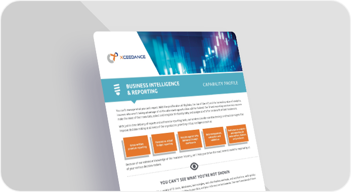 BUSINESS INTELLIGENCE CAPABILITY PROFILE & REPORTING You can’t manage what you can’t report. With the proliferation of Big Data, the rise of the IoT, and the increasing value of analytics, insurers who aren’t taking advantage of all the attendant opportunities will fall behind. Our BI and reporting services help insurers make the most of their own data, collect and integrate third-party data, and analyze all of it for the benefit of their businesses. With just-in-time delivery of reports and self-service reporting tools, our services provide essential strategic and tactical insights that improve decision making at all levels of the organization, providing critical intelligence such as: Results against KPIs Data management, Performance analytics Gross written Forecast vs. actual delivered through extraction and and reporting on premium reporting budget reporting dashboards validation underwriters, brokers, and producers Because of our extensive knowledge of the insurance industry, we’ll help you derive the exact metrics and KPIs required by all of your various decision makers. YOU CAN’T SEE WHAT YOU’RE NOT SHOWN Given our experience with a variety of BI tools, databases, technologies, web distribution methods, and applications, we’ll quickly assess your reporting needs and issues, the irregularities in your data, and your information bottlenecks. Then we’ll resolve all of them to achieve your specific requirements. We’ll help you: Develop your data and reporting strategy Develop the functionally appropriate data warehouse Convert your data and model it optimally Create your dashboards and other visualization tools Most important we’re familiar with the BI and analytics tools available in the insurance industry: SSRS, QlikSense, Power BI, Tableau, So t4Sight, Board, Peloton, and others. We also know and work with vendor-integrated reporting tools like Simple Solve, Duck Creek’s Shred and Yodil, Diamond, eBix-Infinity, SNL’s iPartners, Guidewire’s EagleEye Analytics and Millbrook, and more. And we’re capable of building custom applications to meet your specific requirements. XCEEDANCE BOSTON, USA LONDON, UK KRAKOW, POLAND NCR & BANGALORE, INDIA [email protected] www.xceedance.com +1 (617) 531-2158 +44 (0) 203 786 1225 +48 12 384 66 17 +91 124 479 7800 / ext. 201