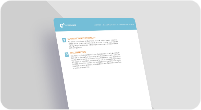 CASE STUDY | Direct Selling Platform for Commercial Lines Insurance SCALABILITY AND EXTENSIBILITY The website is scalable and can be enhanced to include multiple insurance products and carriers. Since all the interactions occur via web service APIs, the system can be integrated with any rating and pricing engine, underwriting management engine, claims system or third- party data aggregator. SUCCESS FACTORS With most of the client’s team based offshore, the initial product was built with minimal up- front cost. For the majority of cases, quotes and policies were written online with no help required from the customer service team. Those policies were sold online without any help desk support to policyholders, demonstrating the superior online purchasing experience. Xceedance also used the experience of actual shoppers interacting with the online portal to implement continuous optimization, making the process more efficient and responsive based on dynamic usage experience. BOSTON, USA LONDON, UK MUNICH, GERMANY [email protected] www.xceedance.com +1 (617) 531-2158 +44 (0) 203 786 1225 +49 175 693 8732 © 2019 Xceedance