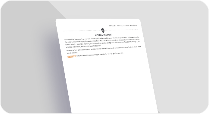 CAPABILITY PROFILE | Insurance Data Sciences INSURANCE FIRST We created the Xceedance Insurance Data Sciences (XIDS) business unit to support the data/analytics needs of the insurance industry. Our team is focused on helping insurance organizations of all sizes and scope capitalize on the advantages of diverse data sources, flexible analytics, responsive reporting, and business-driven decision making. We’re insurance experts first. We’re technologists, data scientists, and creative, problem-solving architects second. Because we’re a global organization, our data sciences team will help you do more business more profitably, no matter where you do business. CONTACT US today to find out how we can help you maximize the value you get from your data.