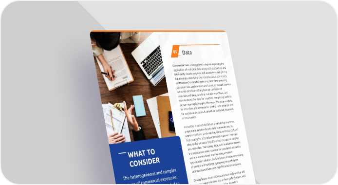 Data I Commercial lines underwriters today are exploring the application of real-time data along with proprietary and third-party data to augment risk assessment and pricing. But the data underlying the risk selection is still mostly unstructured. Instead of spending their time analyzing complex risks, underwriters are having to expend copious amounts of time in sifting through unclear and unstructured data, handling multiple workflows, and standardizing the data for inputting into pricing tools to derive meaningful insights. Moreover, the data needs to be error-free and accurate for pricing to be accurate and for quotes to be quick. It cannot be outdated, incorrect, or incomplete. Innovative insurtech initiatives are enabling real-time, proprietary, and third-party data to pave its way to commercial lines. Underwriting needs such data to be of high quality for it to deliver predictive power. The data should also be easily ingestible into the system to offer any real value. Third-party data, such as address records in property insurance, can now be populated accurately and in a standardized manner using a modern geo-location solution. Such solutions employ geo-coding of parcels and buildings (going way beyond street addresses) and have very high fill rates and accuracy. Driving losses down with data-driven underwriting will require insurers to seek buy-in from policyholders, and more data and time to account for the entire policy lifecycle.