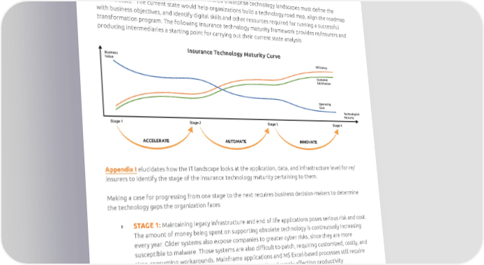 A PRUDENT APPROACH TO TECHNOLOGY TRANSFORMATION As a first step, re/insurers looking to overhaul their enterprise technology landscapes must define the ‘current state’. The current state would help organizations build a technology road map, align the roadmap with business objectives, and identify digital skills and other resources required for running a successful transformation program. The following insurance technology maturity framework provides re/insurers and producing intermediaries a starting point for carrying out their current state analysis: Insurance Technology Maturity Curve Business Value Efficiency Customer Satisfaction Operating Cost Technological Maturity Stage 1 Stage 2 Stage 3 Stage 4 ACCELERATE AUTOMATE INNOVATE Appendix I elucidates how the IT landscape looks at the application, data, and infrastructure level for re/ insurers to identify the stage of the insurance technology maturity pertaining to them. Making a case for progressing from one stage to the next requires business decision-makers to determine the technology gaps the organization faces: ǡ STAGE 1: Maintaining legacy infrastructure and end of life applications poses serious risk and cost. The amount of money being spent on supporting obsolete technology is continuously increasing every year. Older systems also expose companies to greater cyber risks, since they are more susceptible to malware. Those systems are also difficult to patch, requiring customized, costly, and time-consuming workarounds. Mainframe applications and MS Excel-based processes still require almost 80 percent of tasks to be carried out manually, adversely affecting productivity. Ineffective data management prevents organizations from gaining actionable insights into operational and financial data, adversely affecting decision-making. Putting a dollar value on all that risk, loss, profitability, and lack of competitive edge can help CIOs build a solid case for moving to Stage 2 or 3.