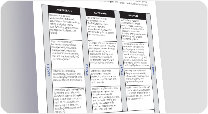 aPPendIx II Technology consulting and insurtech partners can help insurance organizations accelerate digital maturity through strategic interventions – accelerate, automate, and innovate. The following table enlists targeted measures IT decision makers must take to graduate from one stage to the next of the insurance technology maturity framework: ACCELERATE AUTOMATE INNOVATE Develop and deploy Customize and deploy Successfully integrate SOA-based modular web commercial-off-the- cognitive technologies applications for underwriting, shelf (COTS) enterprise such as image processing, rating and price engine, software and white- sentiment analysis, artificial CAT modeling and exposure labeled applications, while intelligence, machine management, claims, and implementing dockerization learning, and neural network billing and microservices processing with existing enterprise systems Digitize processes by Optimize the user experience Harness the power of the implementing workflow and ensure system reliability internet of things (IoT) by management, document and responsiveness through deploying and managing management, customer continuous integration, sensor devices including relationship management, deployment, testing, and health tracking monitors, content management, and monitoring. Expose APIs on-board diagnostics (OBD) user management to interact effectively with devices, and water and gas producing intermediaries sensors to prevent mishaps GE 1 GE 2 GE 3and simplify claims processes GE 4 A Enhance extendibility, A Drive enterprise-wide A Reinvigorate application A T T T T S adaptability, scalability and S automation initiatives S lifecycle management by S reusability by implementing leveraging robotic process achieving DevOps maturity, state-of-the-art architecture automation, OCR, NLP, IVR, improving agility and and chatbots operational support Streamline data management Establish sophisticated data Build a robust data lake and by setting up a relational management processes create a Hadoop ecosystem database, standardizing the for data warehousing, to manage large volumes of data in line with standards integration, archival, purging, disparate data and support such as ISO, ACORD, etc., and retrieval. Enable 3rd- Big Data analytics migrating the data, and party integration with enabling dashboards and external data sources via reporting APIs, SDK, and PaaS Move computing from the mainframe to the client-server model (n-tier Achieve risk-free cloud migration for various cloud deployment deployment), and enable models – public, private, and hybrid, and automate network hardware virtualization, management, server monitoring and notifications management. clustering, and load balancing