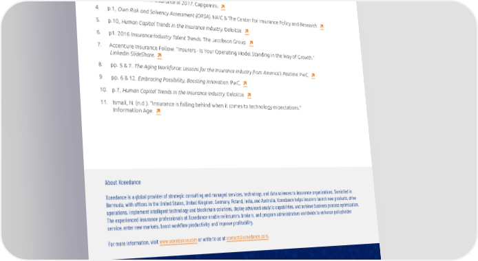 references 1. Yoder, Jamie. “Top 7 Insurance Industry Concerns for 2017.” PropertyCasualty360. 2. p.2, Human Capital Trends in the Insurance Industry. Deloitte. 3. p.1, Top 10 Trends in Insurance in 2017. Capgemini. 4. p.1, Own Risk and Solvency Assessment (ORSA). NAIC & The Center for Insurance Policy and Research. 5. p.10, Human Capital Trends in the Insurance Industry. Deloitte. 6. p1. 2016 Insurance Industry Talent Trends. The Jacobson Group. 7. Accenture Insurance Follow. “Insurers - Is Your Operating Model Standing in the Way of Growth.” LinkedIn SlideShare. 8. pp. 5 & 7. The Aging Workforce: Lessons for the Insurance Industry from America's Pastime. PwC. 9. pp. 6 & 12. Embracing Possibility, Boosting Innovation. PwC. 10. p.7, Human Capital Trends in the Insurance Industry. Deloitte. 11. Ismail, N. (n.d.). "Insurance is falling behind when it comes to technology expectations." Information Age. About Xceedance Xceedance is a global provider of strategic consulting and managed services, technology, and data sciences to insurance organizations. Domiciled in Bermuda, with offices in the United States, United Kingdom, Germany, Poland, India, and Australia, Xceedance helps insurers launch new products, drive operations, implement intelligent technology and blockchain solutions, deploy advanced analytic capabilities, and achieve business process optimization. The experienced insurance professionals at Xceedance enable re/insurers, brokers, and program administrators worldwide to enhance policyholder service, enter new markets, boost workflow productivity, and improve profitability. For more information, visit www.xceedance.com or write to us at [email protected]. USA UK Germany Poland India Australia