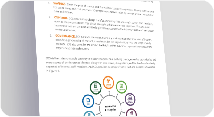the PrIncIPles of sos Insurance organizations will need to incorporate expertise, skills, responsiveness, flexibility, and technical facility to better navigate the evolving nature of the industry. To ensure those attributes — and in recruiting and retaining them in-house — SOS provides: 1. SAVINGS. Given the pace of change and the reality of competitive pressure, there’s no more room for scope creep and cost overruns. SOS improves combined ratios by saving significant amounts of time and money. 2. CONTROL. SOS ensures knowledge transfer, imparting skills and insight to core staff members, even as they organizations free those people to achieve corporate objectives. That will allow 9 and better insurers to “attract the best and the brightest newcomers to the industry workforce” control outcomes. 3. GOVERNANCE. SOS parallels the scope, authority, and organizational structures of insurers, provides a single point of contact, operates under the organizations KPIs, and keeps projects on track. SOS also provides the kind of forthright advice insurance organizations expect from experienced internal sources. SOS delivers demonstrable currency in insurance operations, evolving trends, emerging technologies, and every aspect of the insurance lifecycle, along with credentials, designations, and the hands-on familiarity expected of internal staff members. And SOS provides expert proficiency in all the disciplines illustrated in Figure 1.